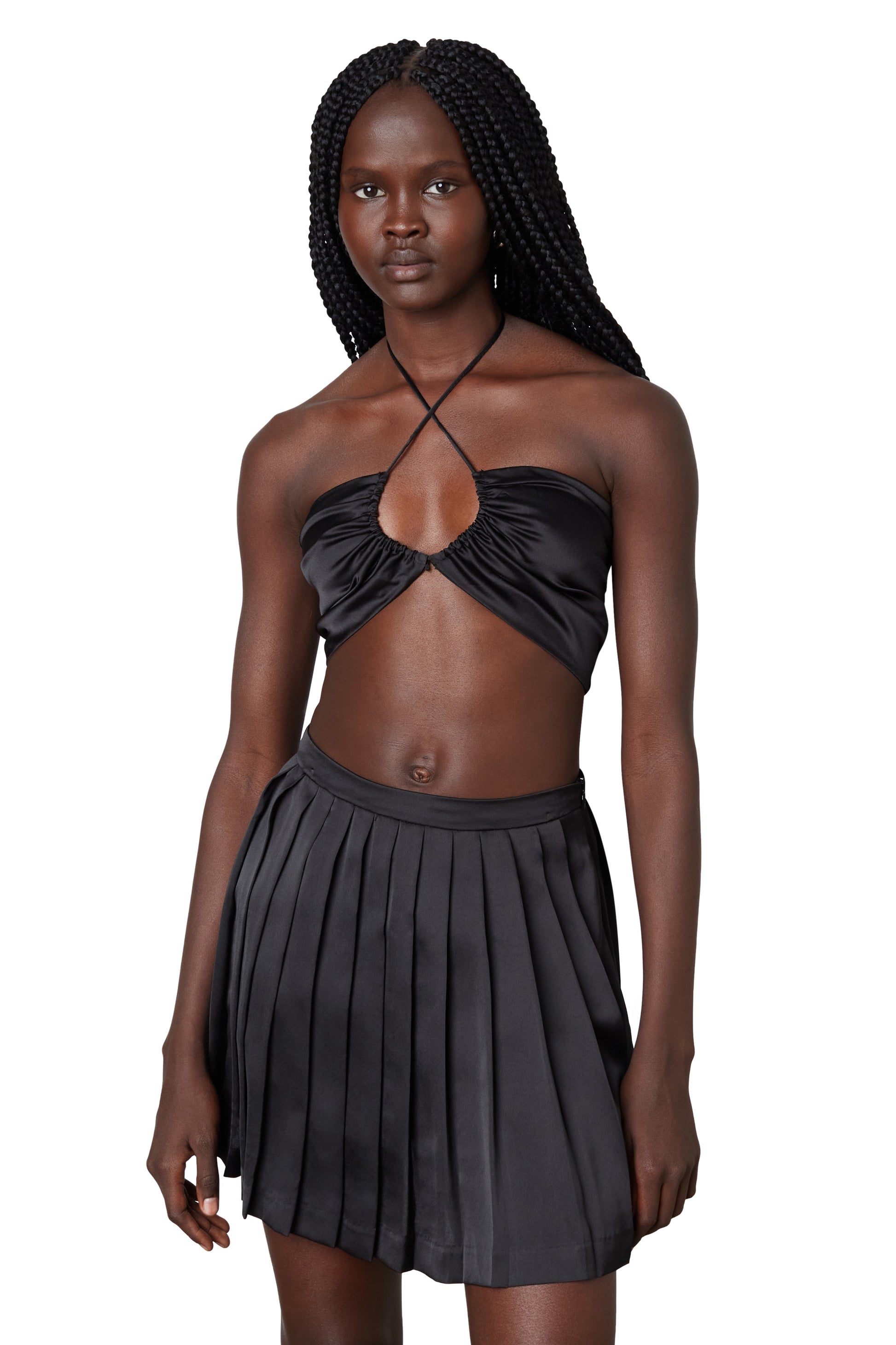 A cross halter satin top featuring a smock back. It may be worn/altered in multiple ways.