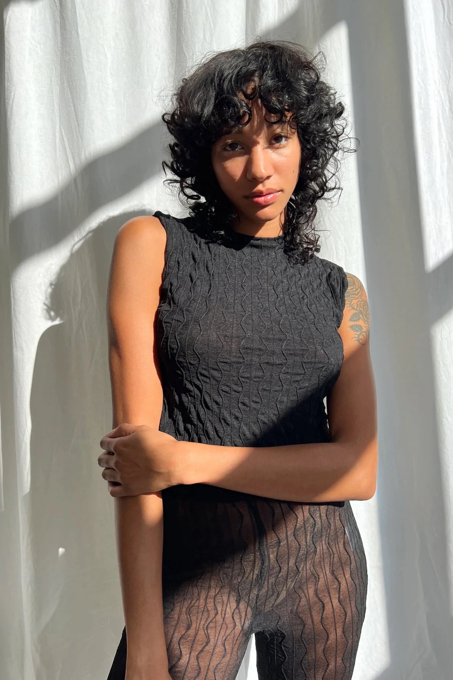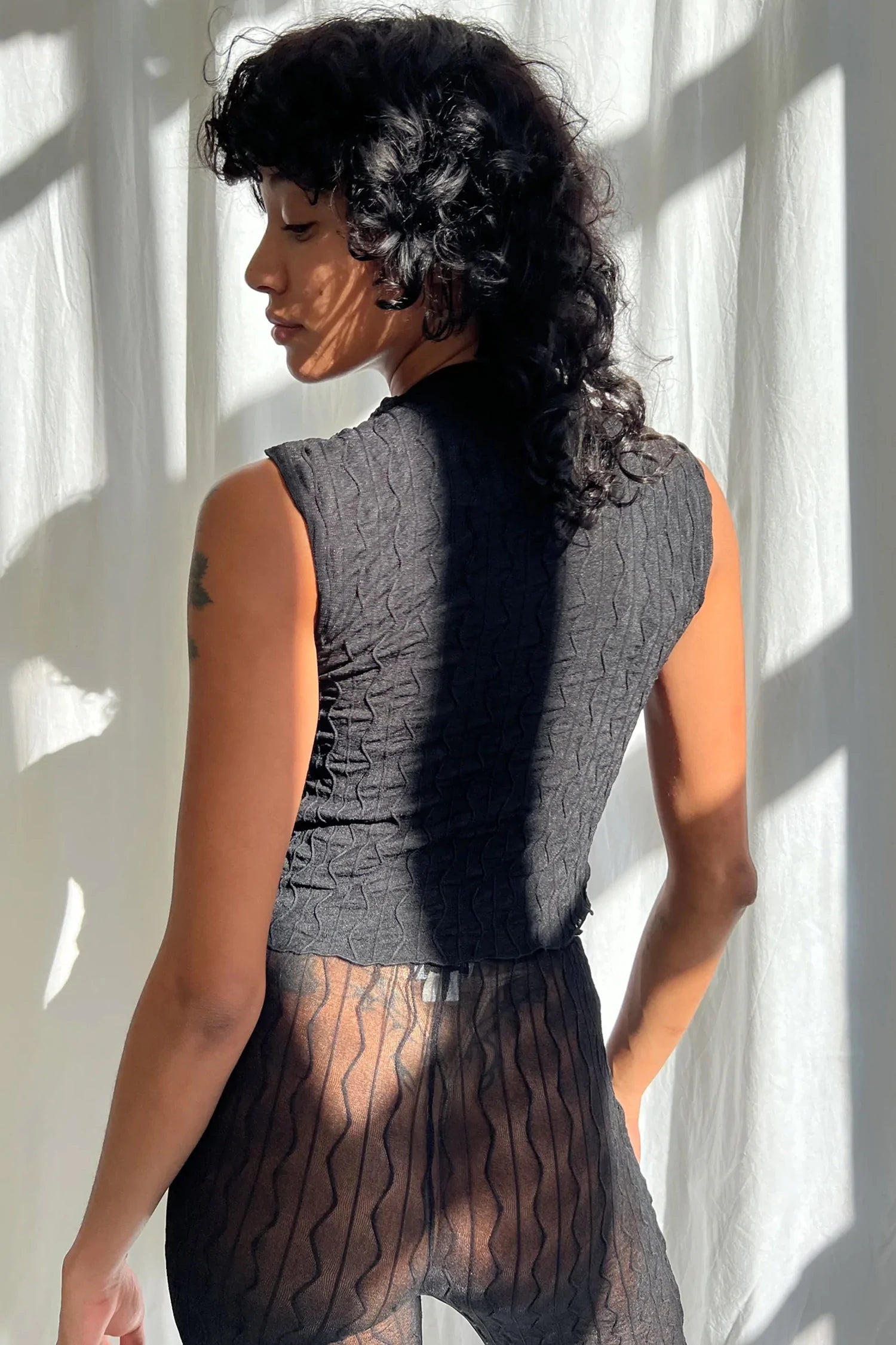 High neck with a cap sleeve and cropped fit for the cutest model-off-duty look.